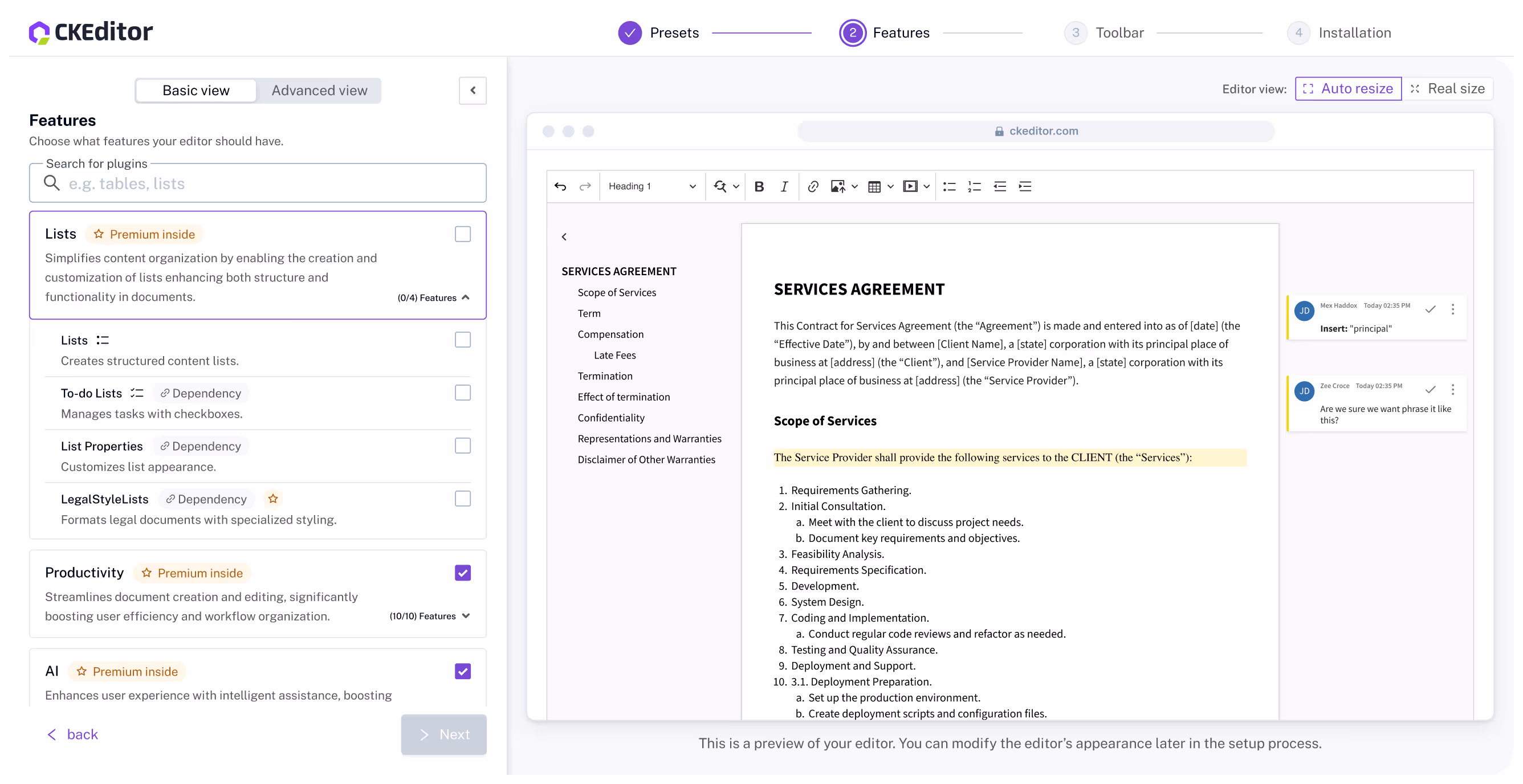 npm install ckeditor5-premium-featuresCreate a free account or contact sales to test all premium features on a self-hosted distribution with a 14-day free trial.