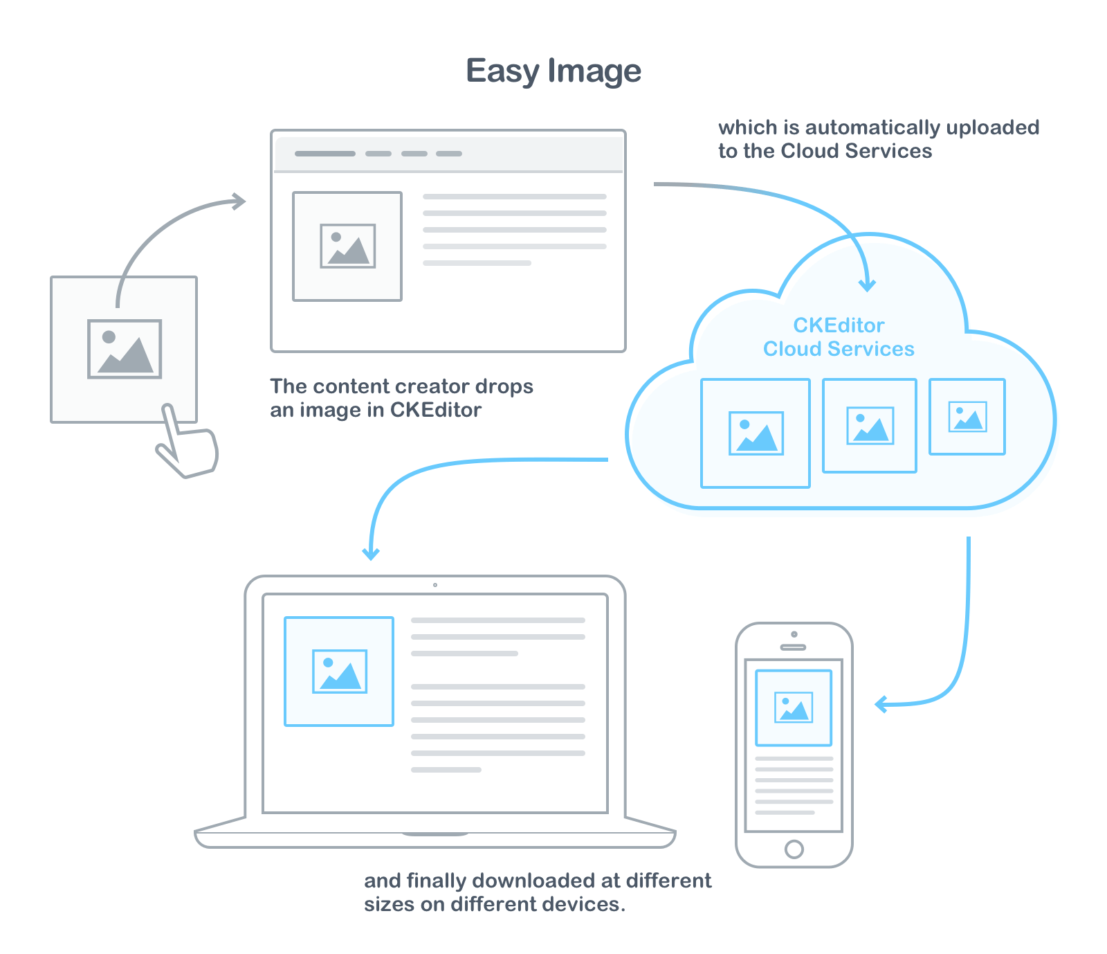 Easy Image guarantees that all images inserted into your content are responsive. With a single image upload, several optimized versions of the image are created after upload by CKEditor Cloud Services, for different sizes of displays. All this is transparent to the end user who uploaded the image. Rescaled and optimized images are delivered through the CDN.
