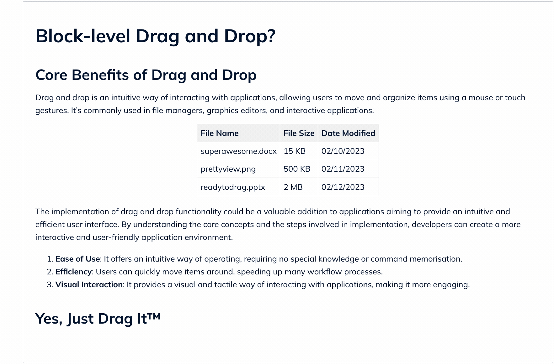 Your requests have been heard! After several rounds of bug fixes and core enhancements, the much-anticipated block-level Drag & Drop feature has been implemented, stabilized and is available by default in CKEditor v40.0.0.