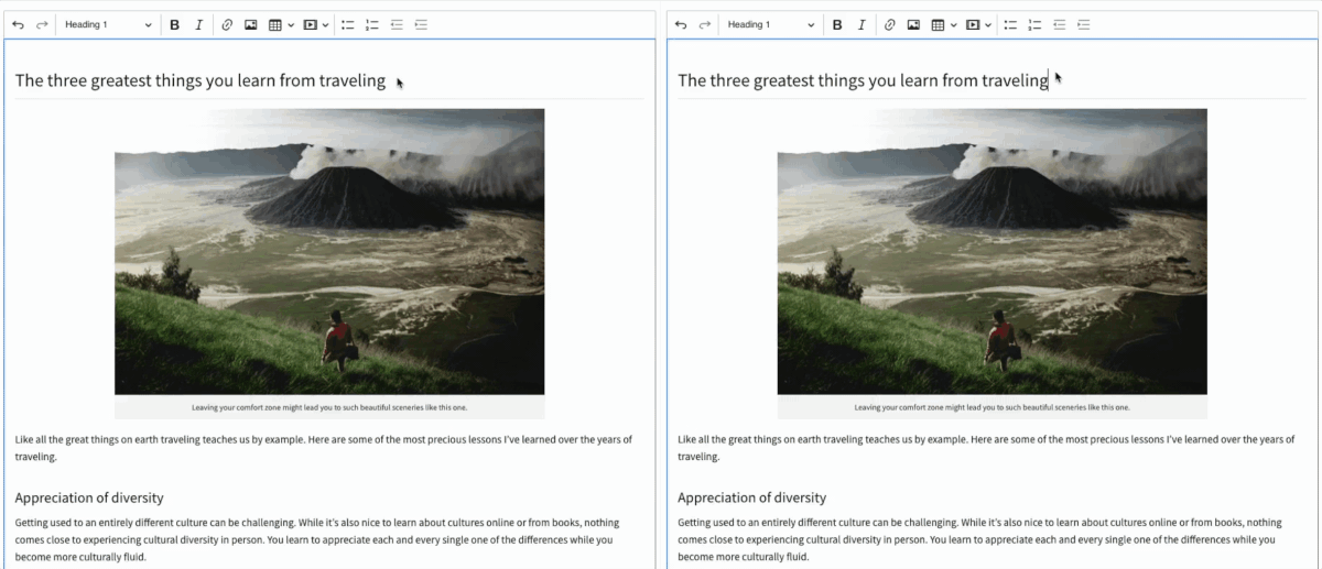 CKEditor v40.1.0 introduces a major update for the Track Changes feature. Previously, with Track Changes turned on, any formatting changes were simply shown with a blue highlight and a description – you couldn’t see how the suggested formatting would look. So, if a colleague made some text into a heading, or resized a large image to make it tiny, the change wasn’t obvious. In some cases, this also limited the editor’s functionality.