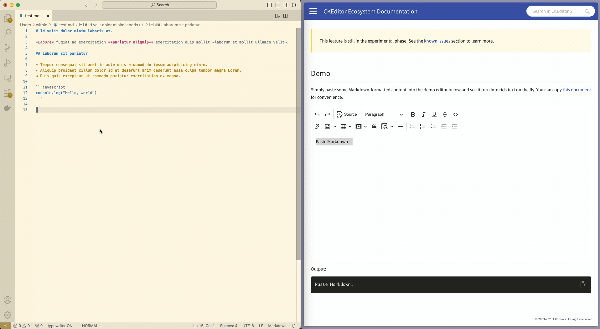 CKEditor v40.2.0 introduces the new, and still experimental, Paste Markdown feature. This feature will automatically format any raw Markdown source or output copy pasted directly into the editor – without having to switch to source editing.