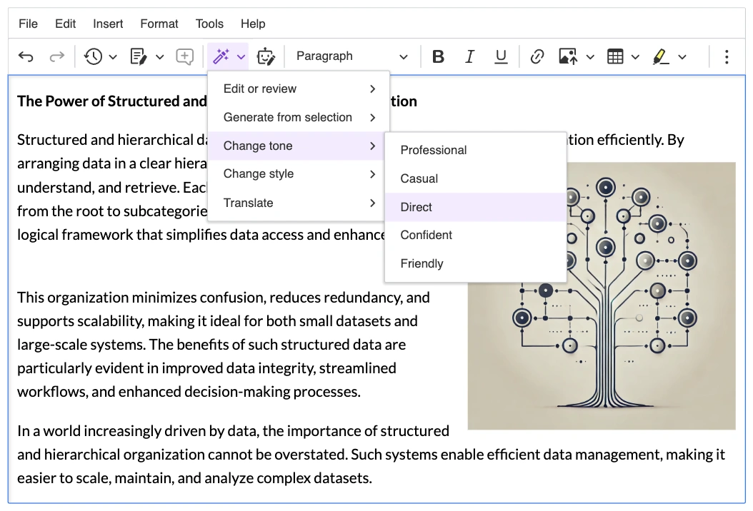 CKEditor 5 v43.1.0 also introduces a new UI component: nested dropdown menu. This component enables plugins developers to easily organize buttons into hierarchical, nested menu structures when introducing custom features. It’s particularly beneficial for features that require users to navigate a wide range of options or settings, as it enhances the user experience by grouping related items in nested menus.