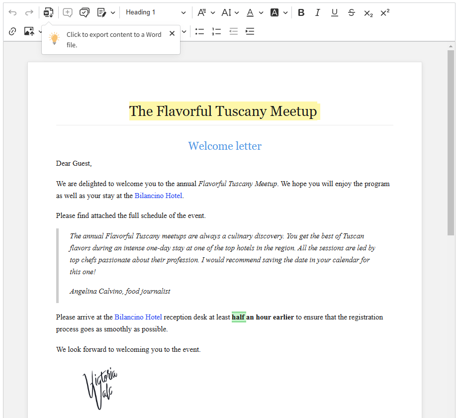 Need to convert your content into professional documents? The Export to PDF and Export to Word features secure your content’s formatting, structure, and media, making it easy to distribute in multiple formats. This is especially useful for finalizing content for clients or for archiving purposes. For a detailed overview of this feature, visit the CKEditor Export to PDF/Word page.