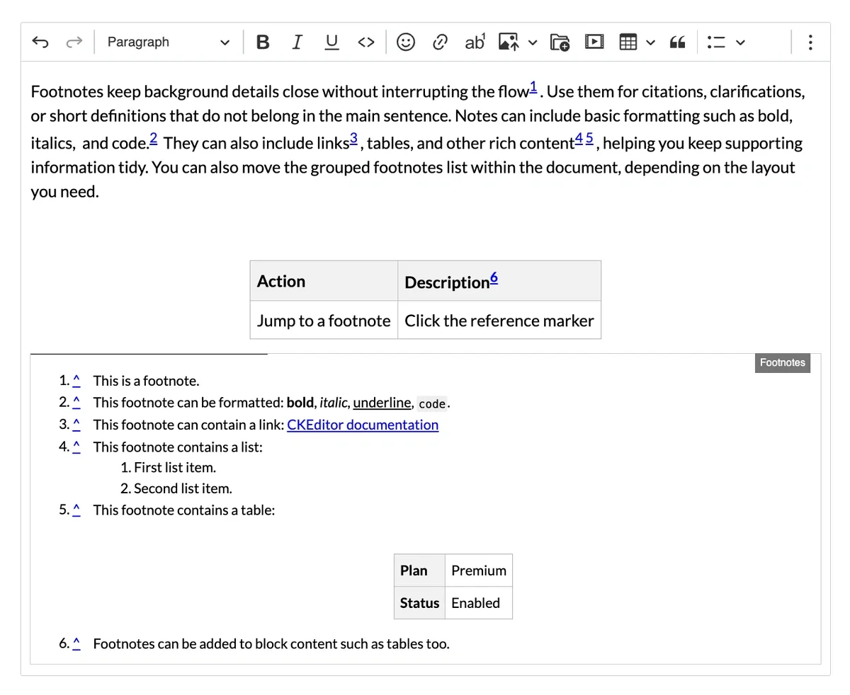 Footnotes allow content authors to include citations, comments, or explanatory notes while keeping the main content clean and focused. In CKEditor, footnotes appear as numbered references and are listed at the end of the document, although users can change locations in the document.
