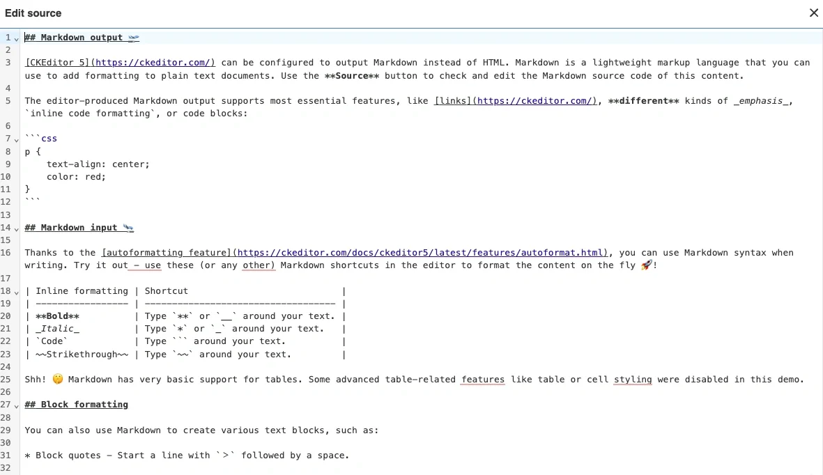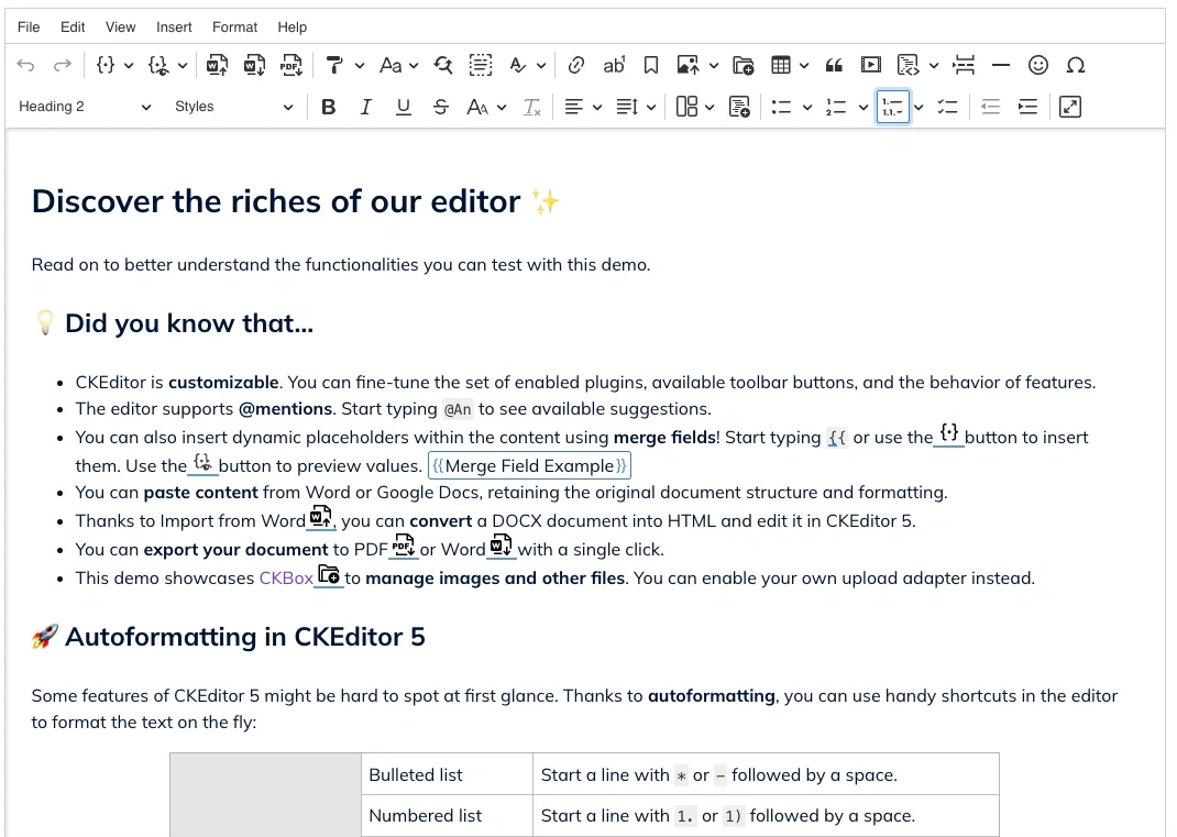 While CKEditor is WYSIWYG-first, it supports Markdown workflows via plugins and integrations. This makes it suitable for hybrid strategies where developers want Markdown compatibility, but the broader team needs visual editing.