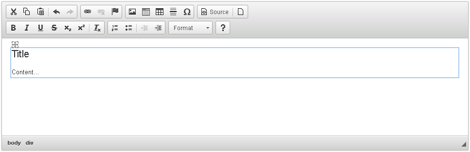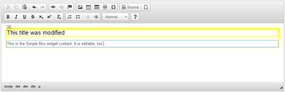 The widget plugin code is now ready. When you click the “Create a Simple Box” button on the editor toolbar, a Simple Box widget will be inserted into the document. The box will contain two editable parts — a title field and a content field. Both can be edited, with available formatting limited to a subset of editor features.