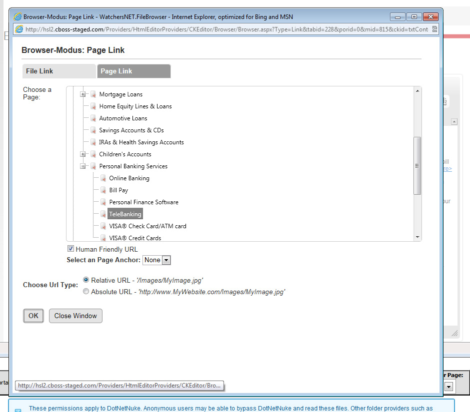 When I try to link to a page within my DNN6 site (see the screenshot attached) after clicking OK this window does nothing. It hangs for a while.