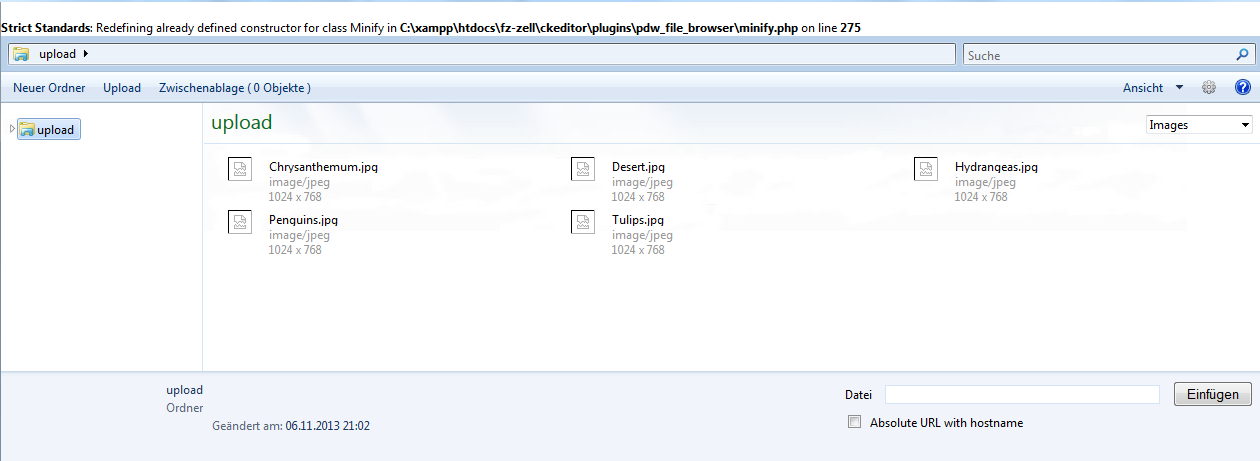 I have a problem with your PDW File Browser. I can upload and use pictures and files. But I can't see any thumbnails. I get a error message which says: "Strict Standards: Redefining already defined constructor for class Minify in C:\xampp\htdocs\fz-zell\ckeditor\plugins\pdw_file_browser\minify.php on line 275"