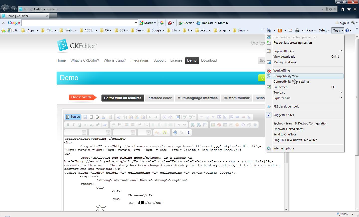 Here is an example from your demo site showing the IE9 compatibility mode problem in CK source mode.