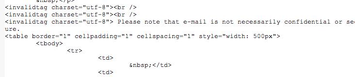 While working with a table, I noticed that when I paste text into an empty cell the text appears above the table when I click the save button. This appears to occur in Chrome 11 on a Mac. I have OS version 10.6.7 installed. Several of our customers have reported this same problem. I'm not sure if it's just related to tables but I've only been able to replicate it with tables. Customers have said they've been able to replicate it using Firefox as well. When I check the source, the only thing I noticed is the following tag: <invalidtag charset="utf-8">. The tag appears before each text that I tried to paste into one of the cells.