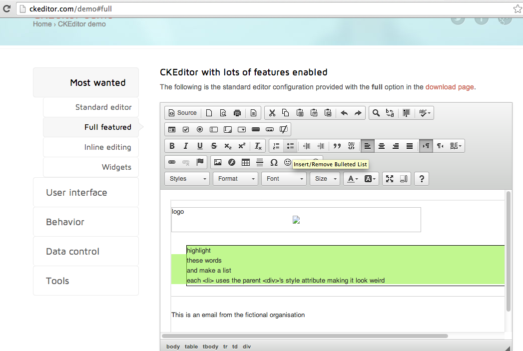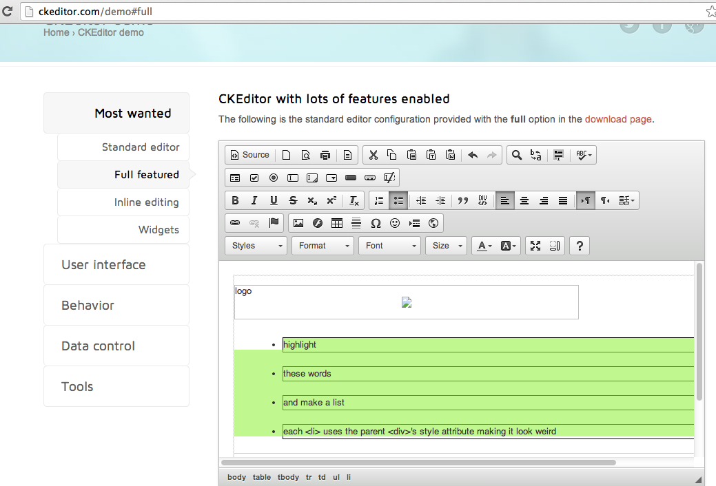 All the files I provided show how I used CKEditor. I managed to do the same thing in the demo http://ckeditor.com/demo#full