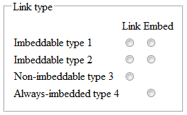 This would be used to imbed or link several types of objects; some can't be imbedded, and some will be imbedded always, but most can be treated either way. Thus, I'd like to have two columns of radio buttons (1st column: link, 2nd column: imbed), and as many rows as I have types. With all of them in the same group, I'd have a one-click-solution.