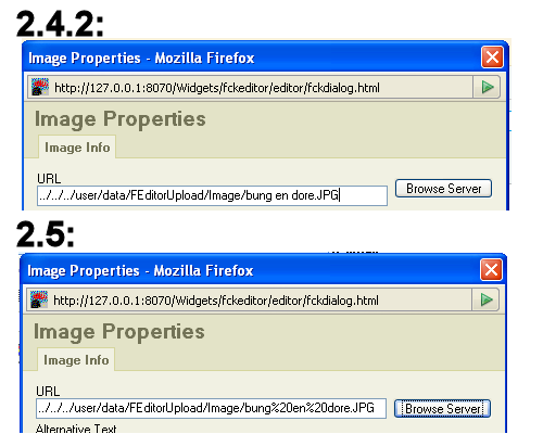 However, the change made to "fix" the problem doesn't prevent URLs being encoded. For example, if I selected the "bung en dore.jpg" file in 2.5, then manually replace the %20 with spaces, the preview still works and the filename with spaces is put into the edited text.